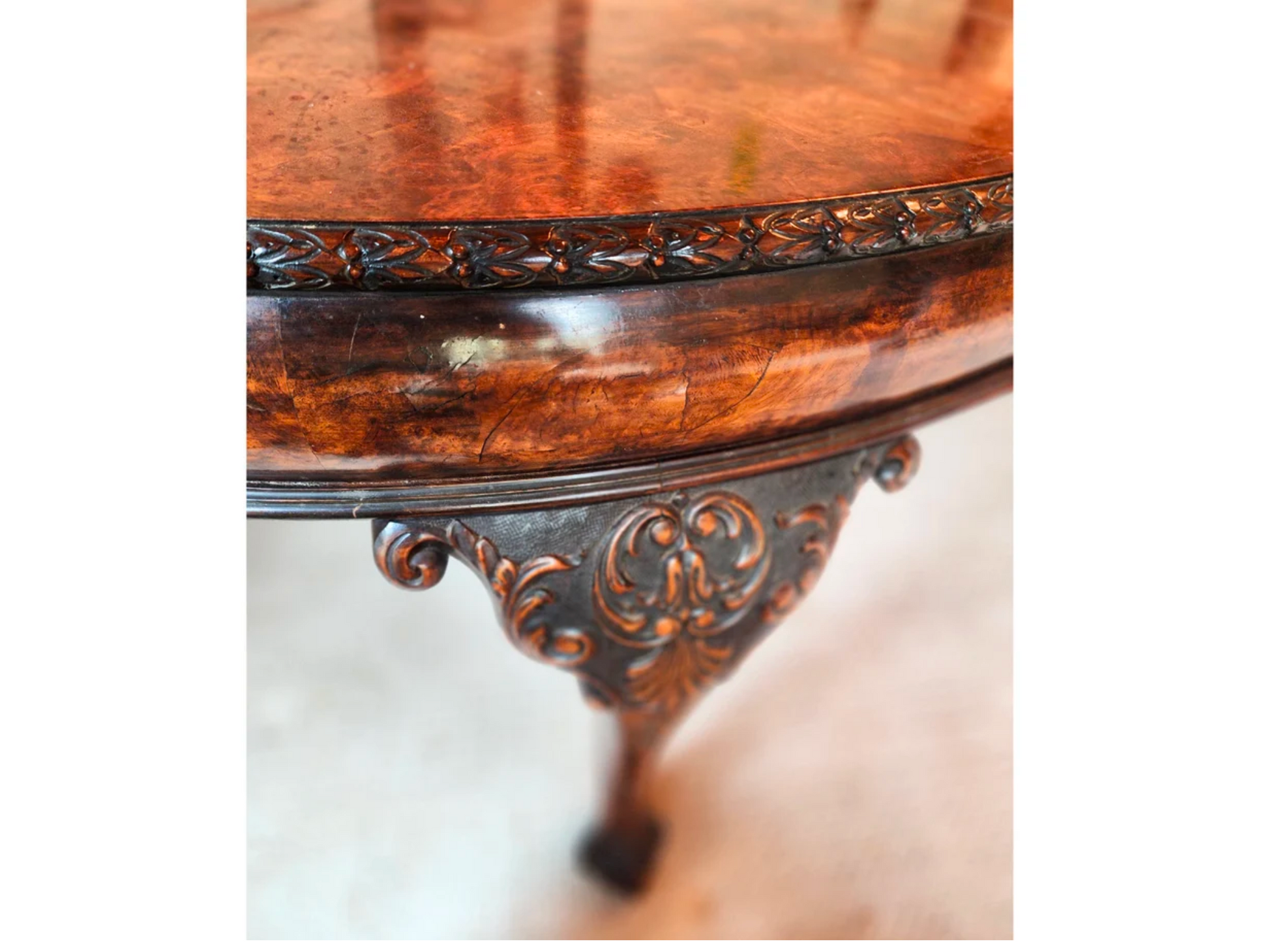 Gorgeous English Antique dining table. Very regal and elegant I would not place a tablecloth because of its beauty. It features a beautiful burlwood, carved edge and frieze and graciously delicately carved ball and claw feet. Finished with carving around the trim. It has 2 original extra leaves each leaf measuring approximately 17".5