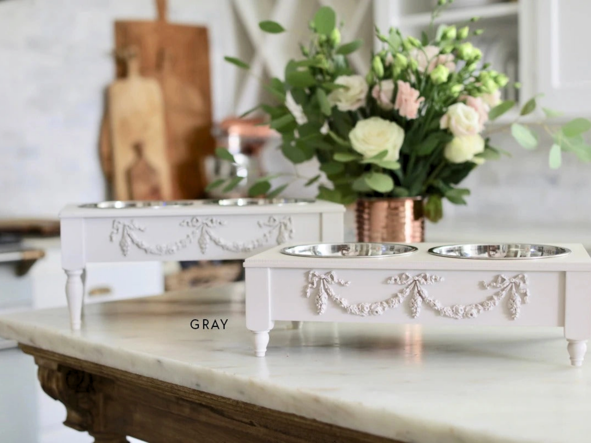 Experience the perfect blend of elegance and functionality with our Rose Swag-raised pet feeder. Its intricate design seamlessly integrates into your decor, catering to your French Country home style. Available in 4.5” tall in soft Gray color, it promotes proper digestion and dining comfort for your beloved furry friend. It makes your little one feel like they belong.