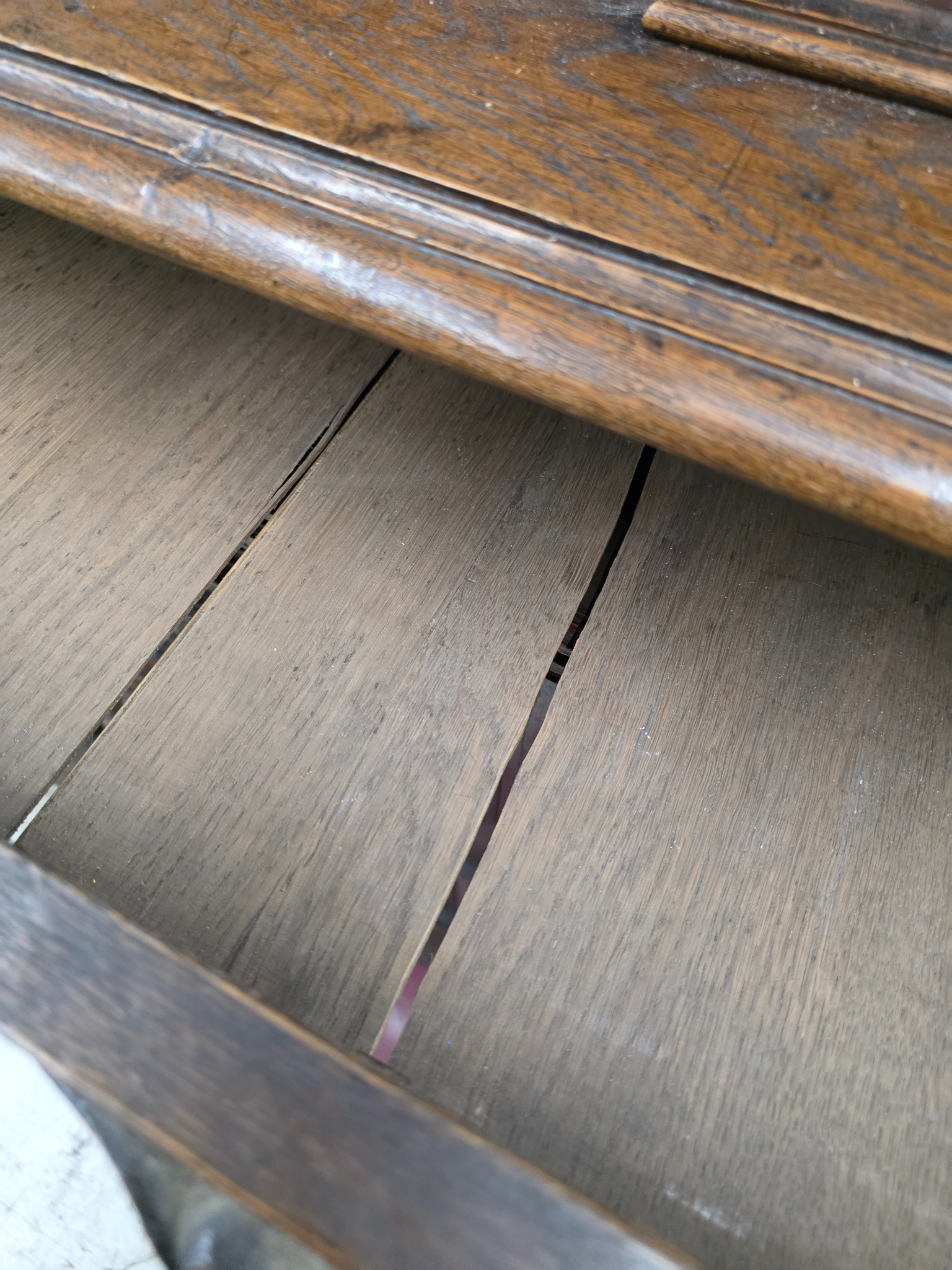 Original hardware is intact, and all doors open and close smoothly. The panels on some sections may show minor separation or movement, consistent with wood’s natural aging process.