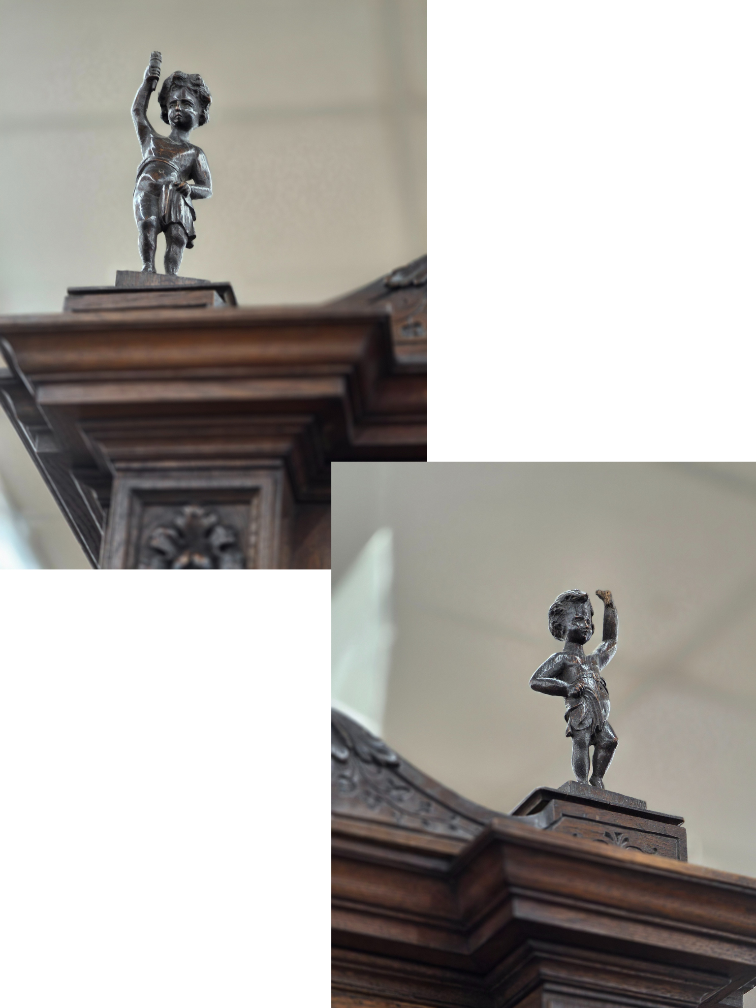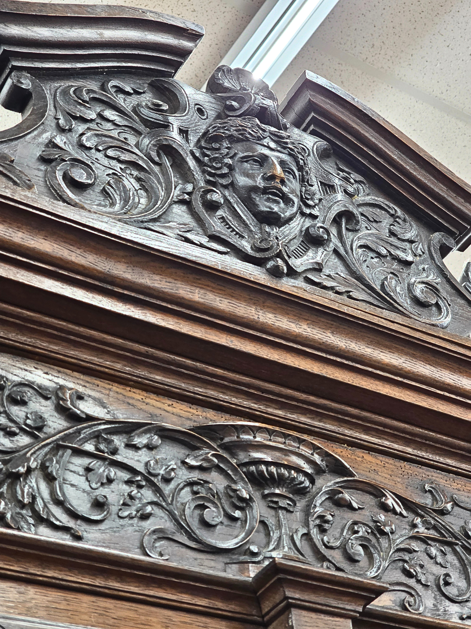 Atop the cabinet, you’ll find a grand pediment with a central mask carving, flanked by finials and mythological faces, embodying the bold decorative elements of the Renaissance Revival period. This type of cabinet was traditionally used in French country estates and hunting lodges to store fine tableware and game service pieces.