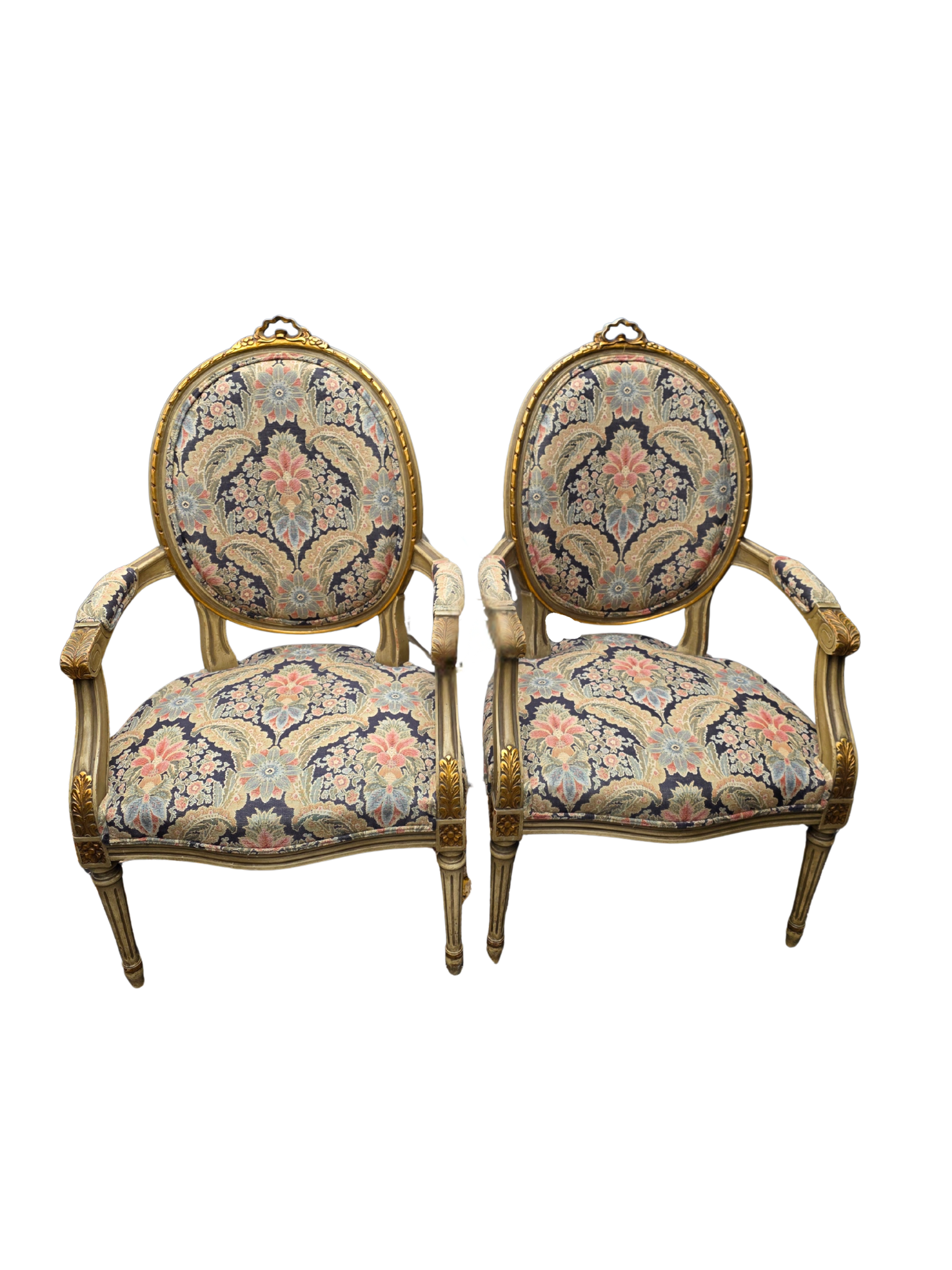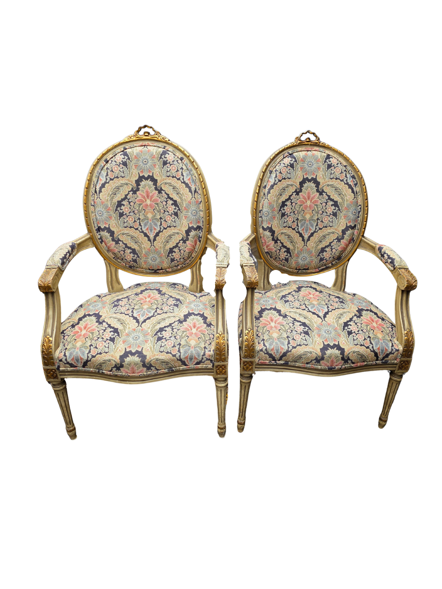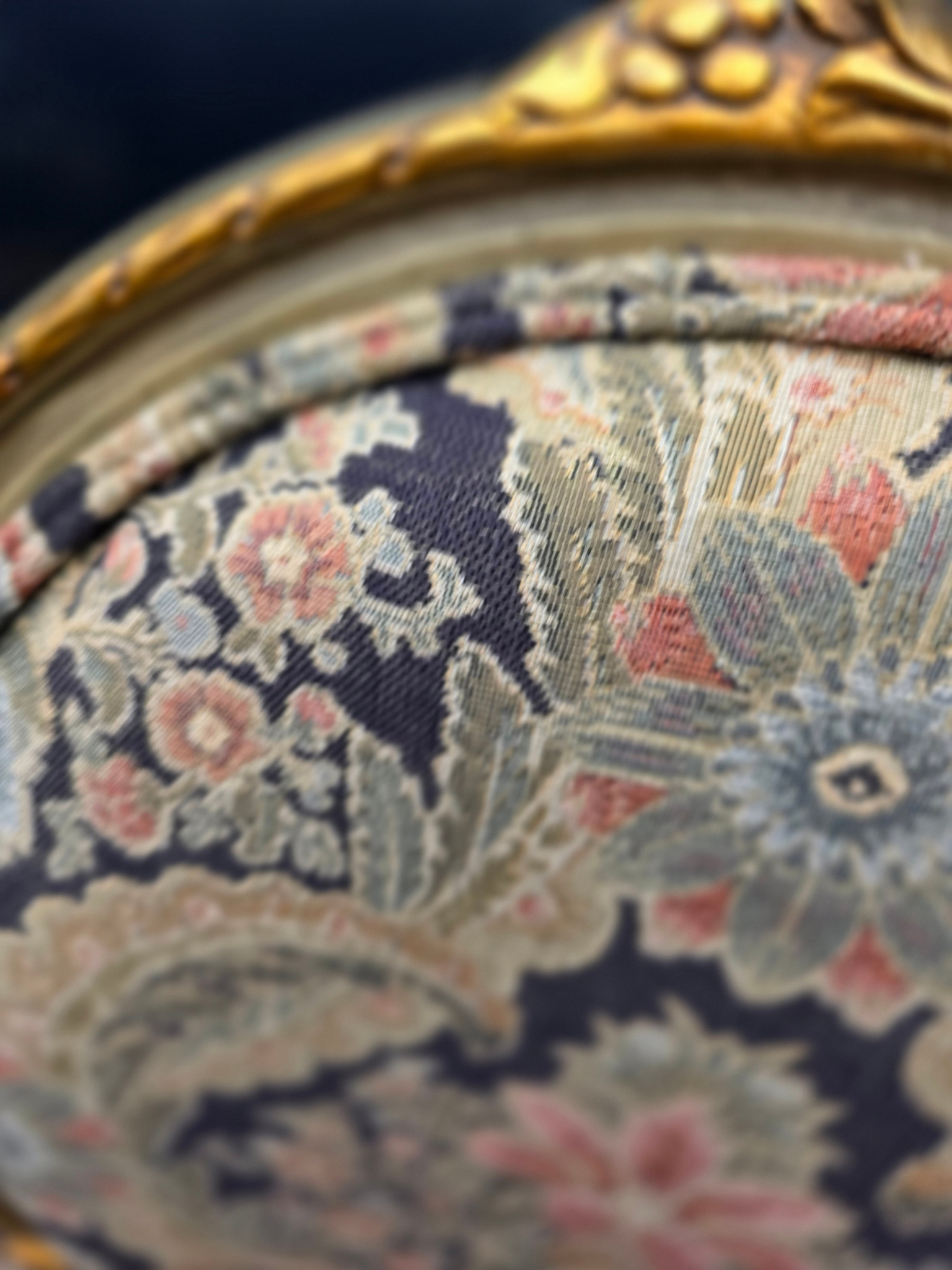 The frames showcase delicate hand-carved details, while the upholstery presents a richly patterned tapestry in deep navy, soft gold, and muted floral tones—an ideal palette for traditional, French, or collected interiors.