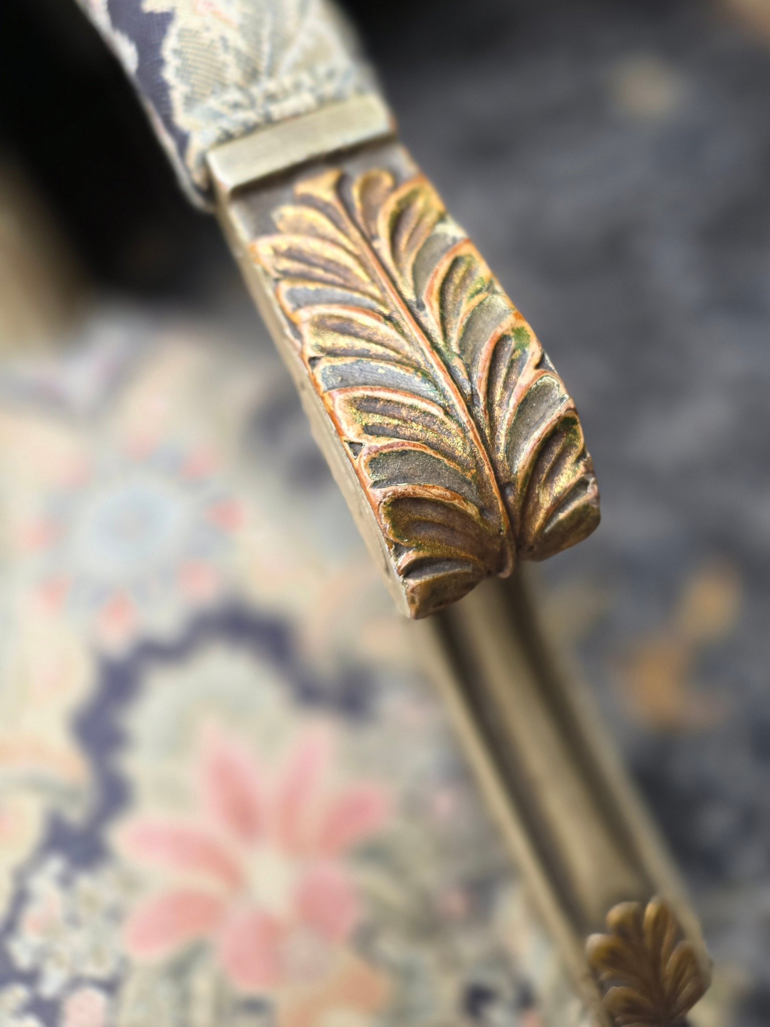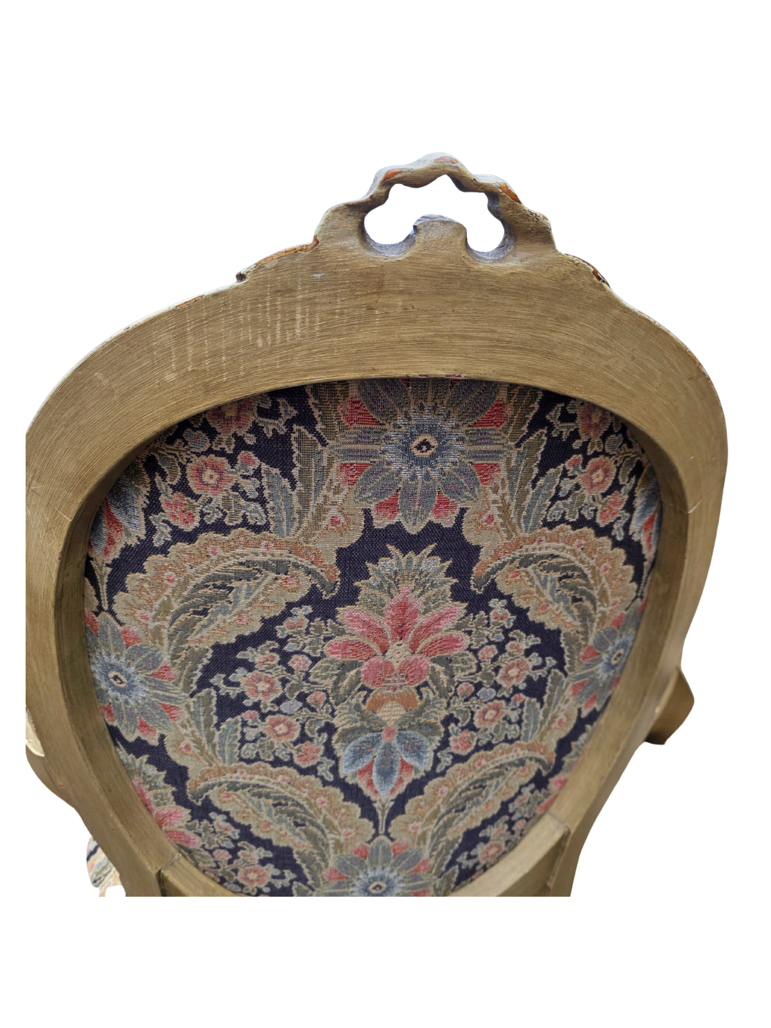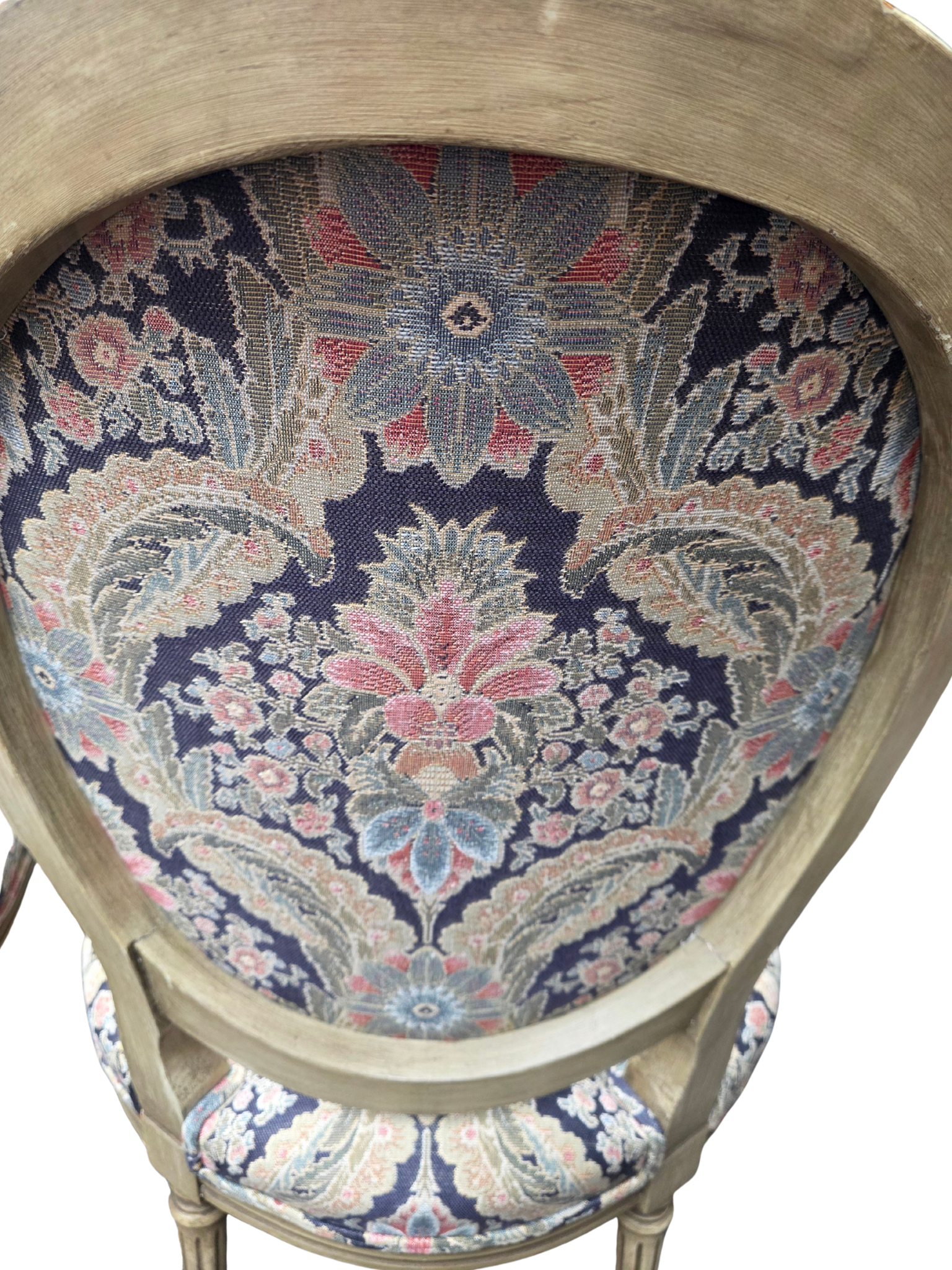 The frames showcase delicate hand-carved details, while the upholstery presents a richly patterned tapestry in deep navy, soft gold, and muted floral tones—an ideal palette for traditional, French, or collected interiors.