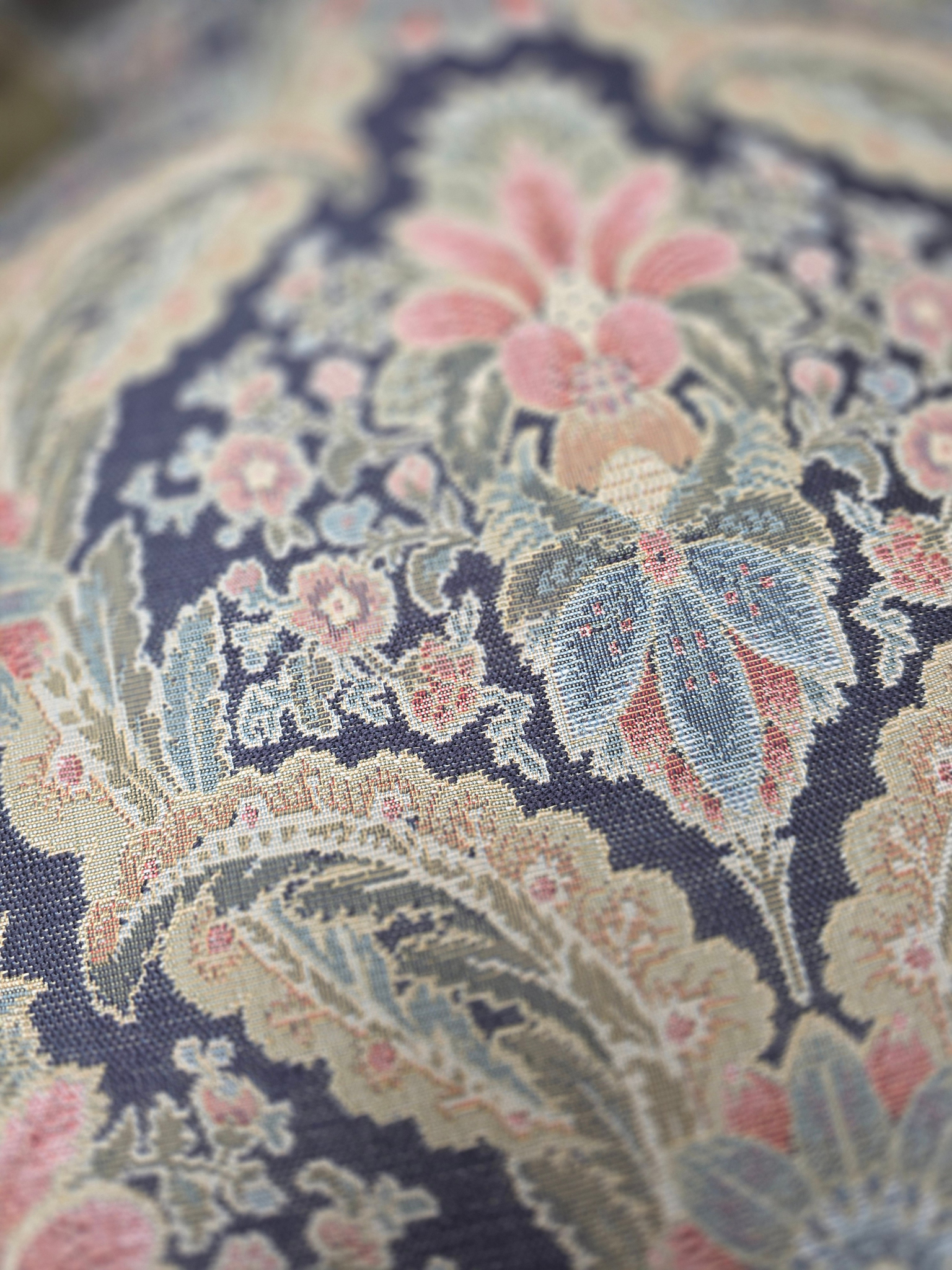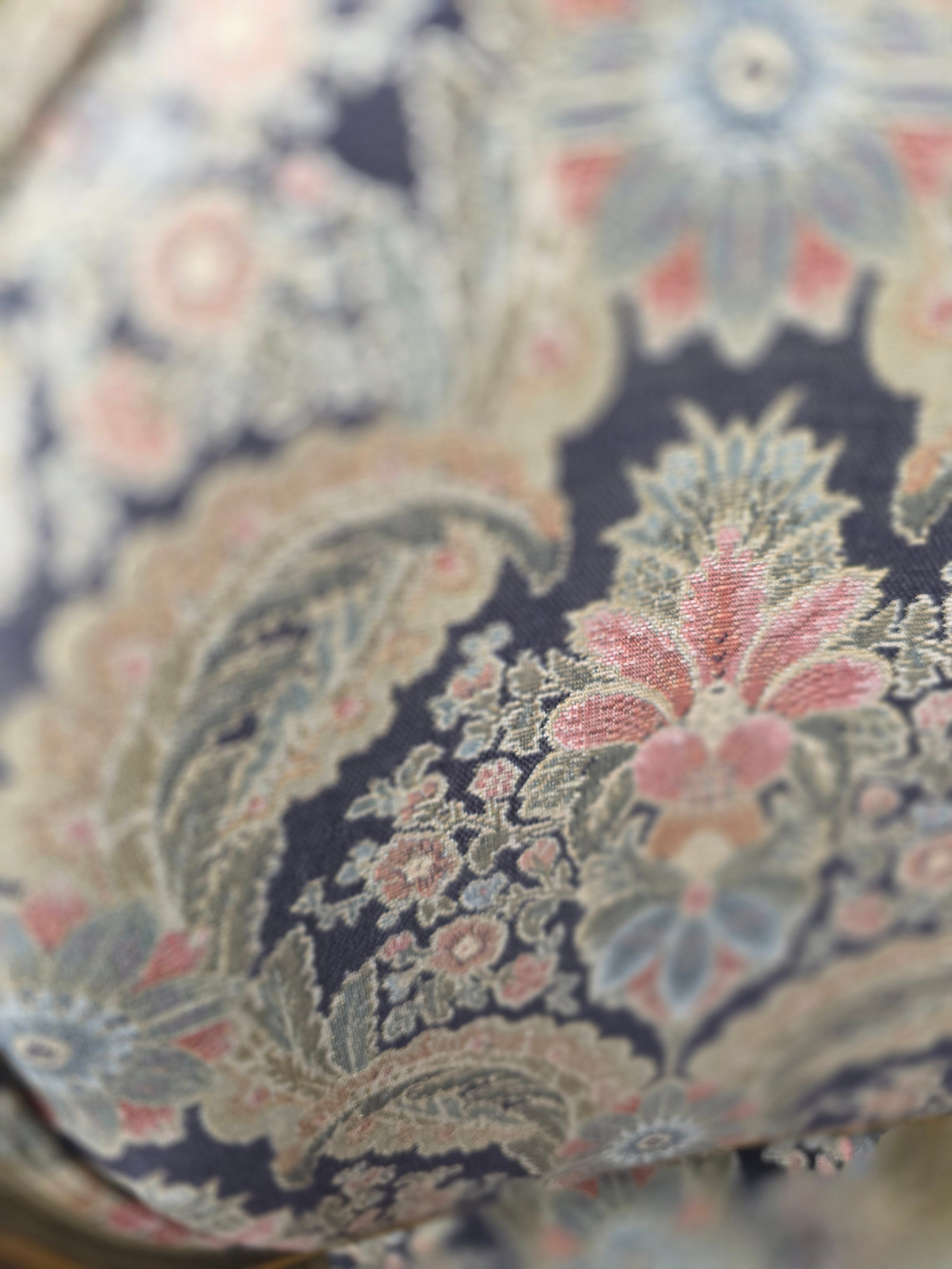 • Upholstery: Tapestry-style floral fabric
