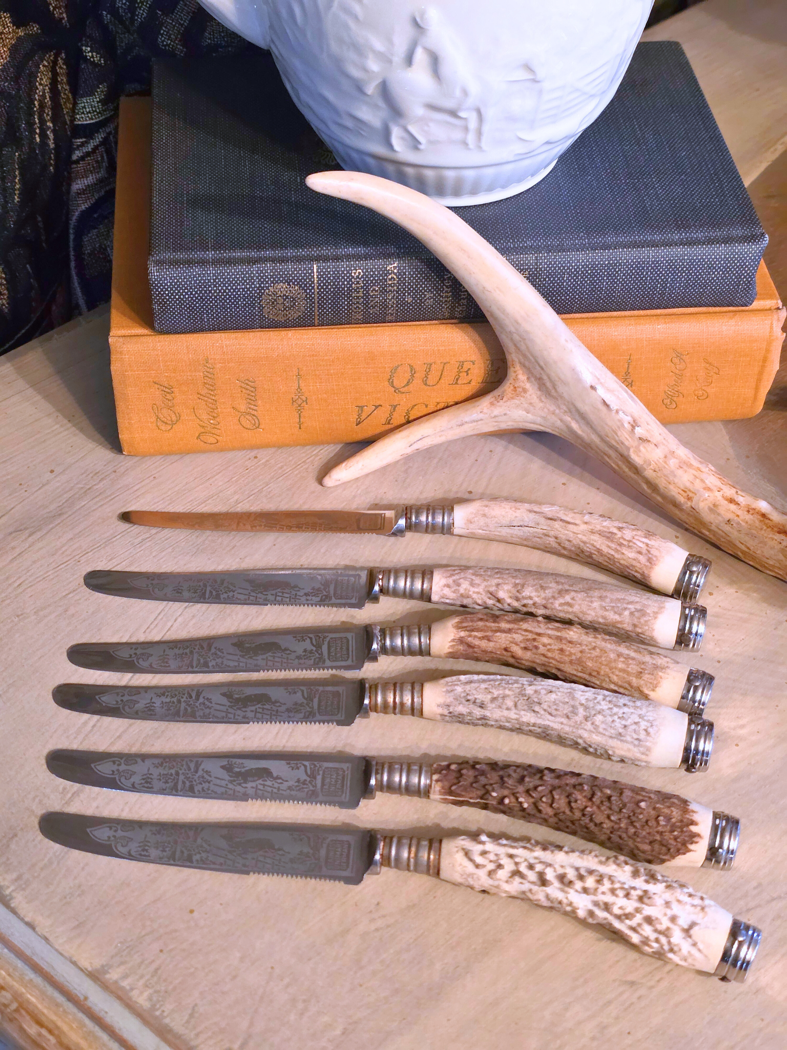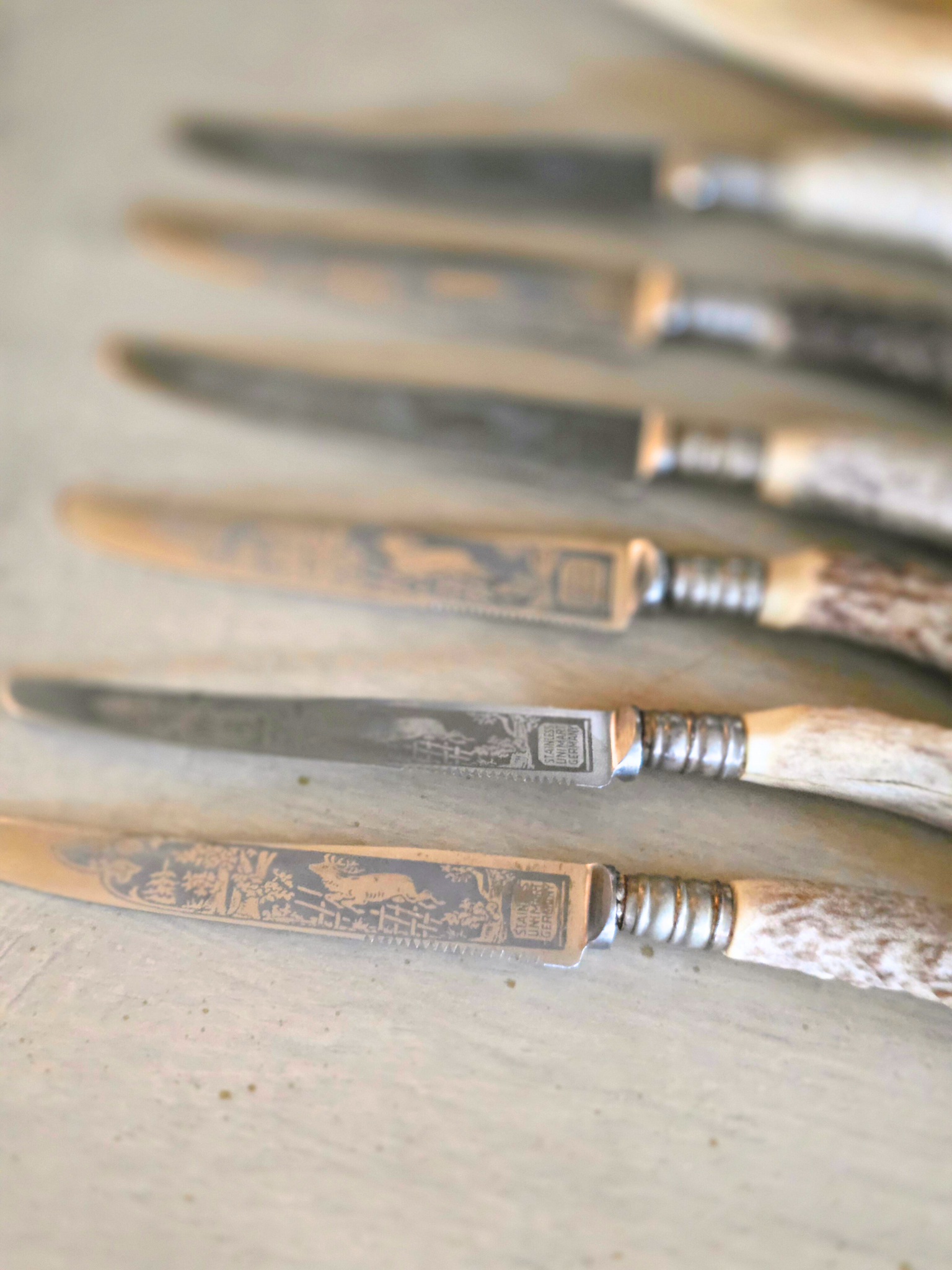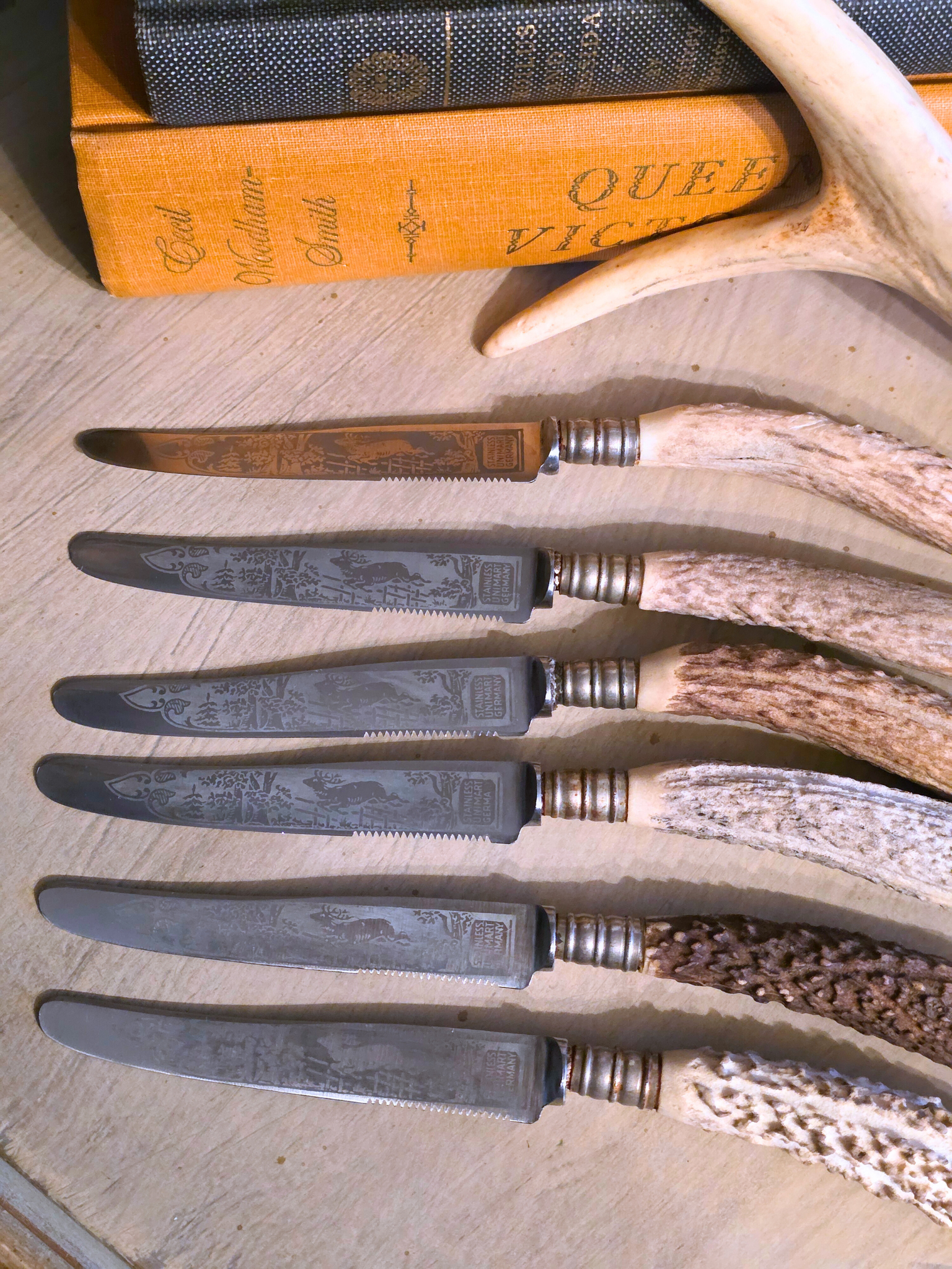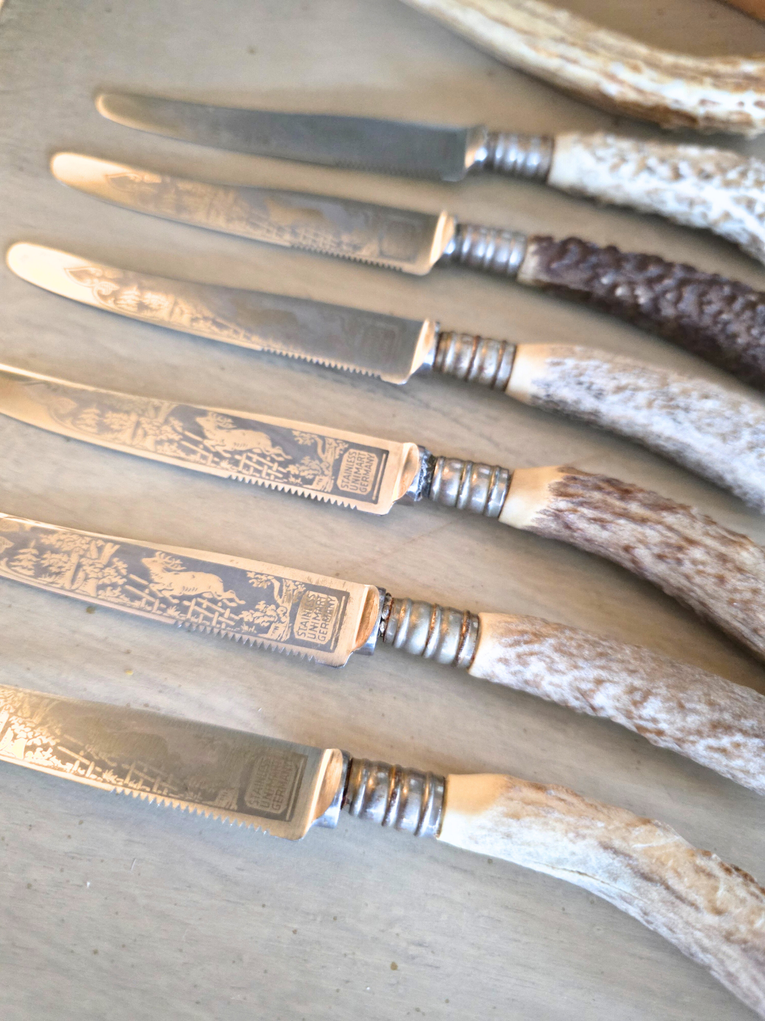 These vintage stag-handle knives embody the essence of the Black Forest aesthetic, featuring beautiful stag engraving and, naturally textured antler handles, old-world craftsmanship, and rugged Alpine charm. Each piece showcases the raw beauty of hand-carved antler, metalwork with a timeworn patina, and classic rustic detailing reminiscent of 19th-century German, great for Black Forest aesthetic displays, or Black Forest tablescape. Set of 6