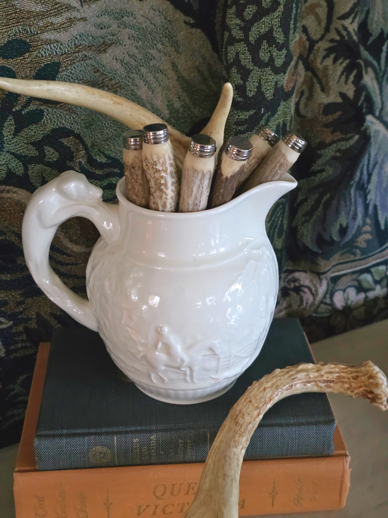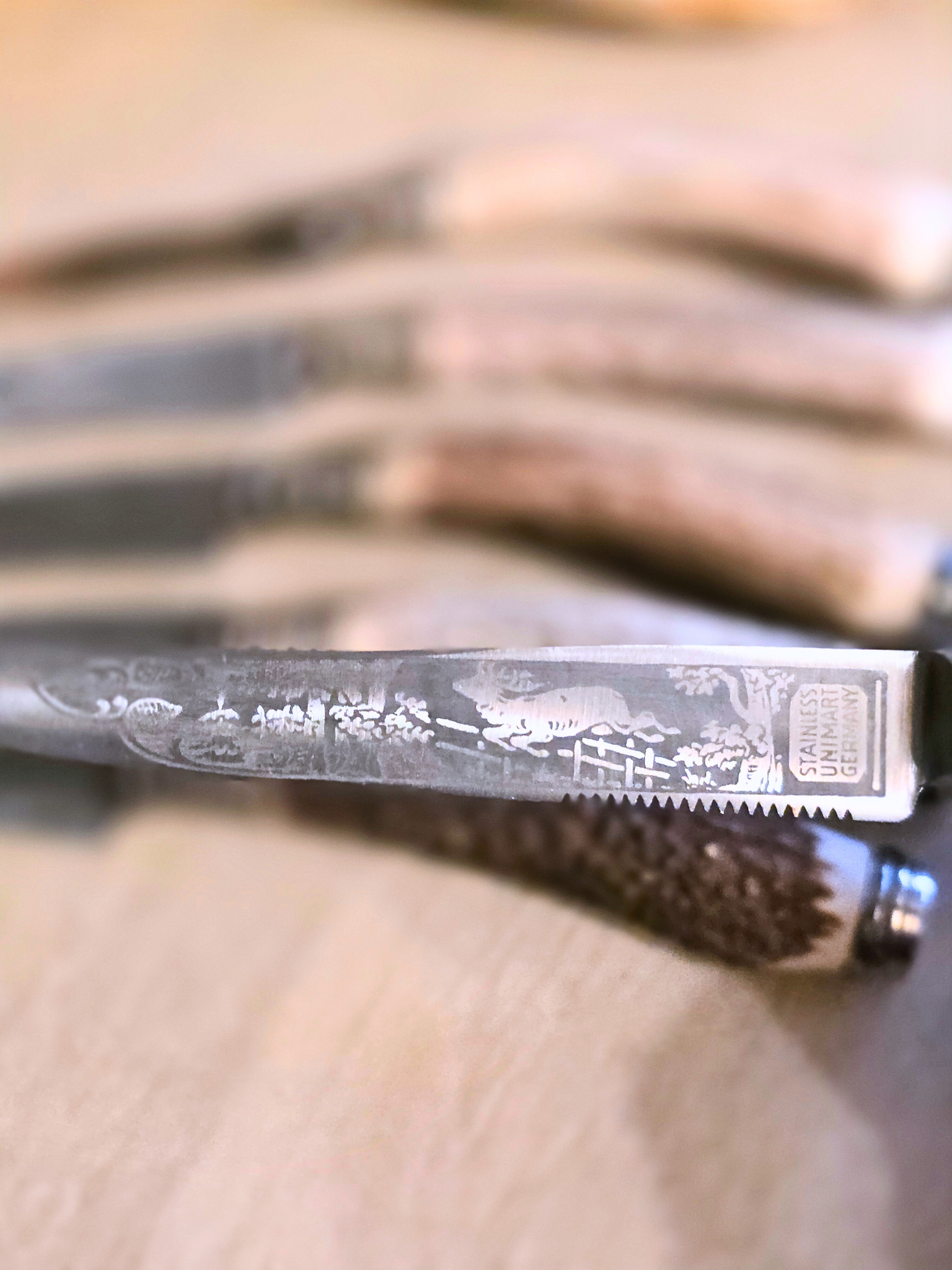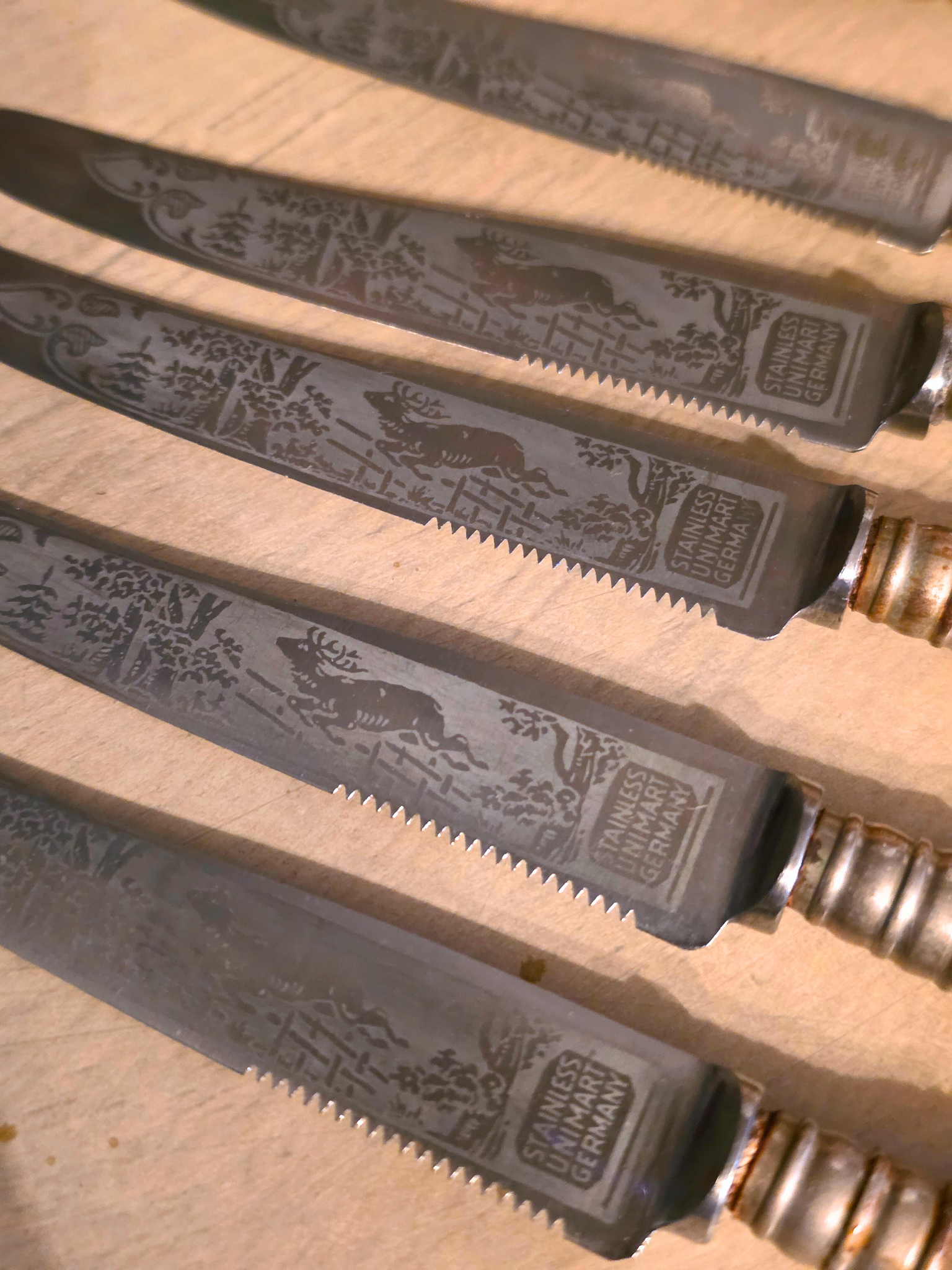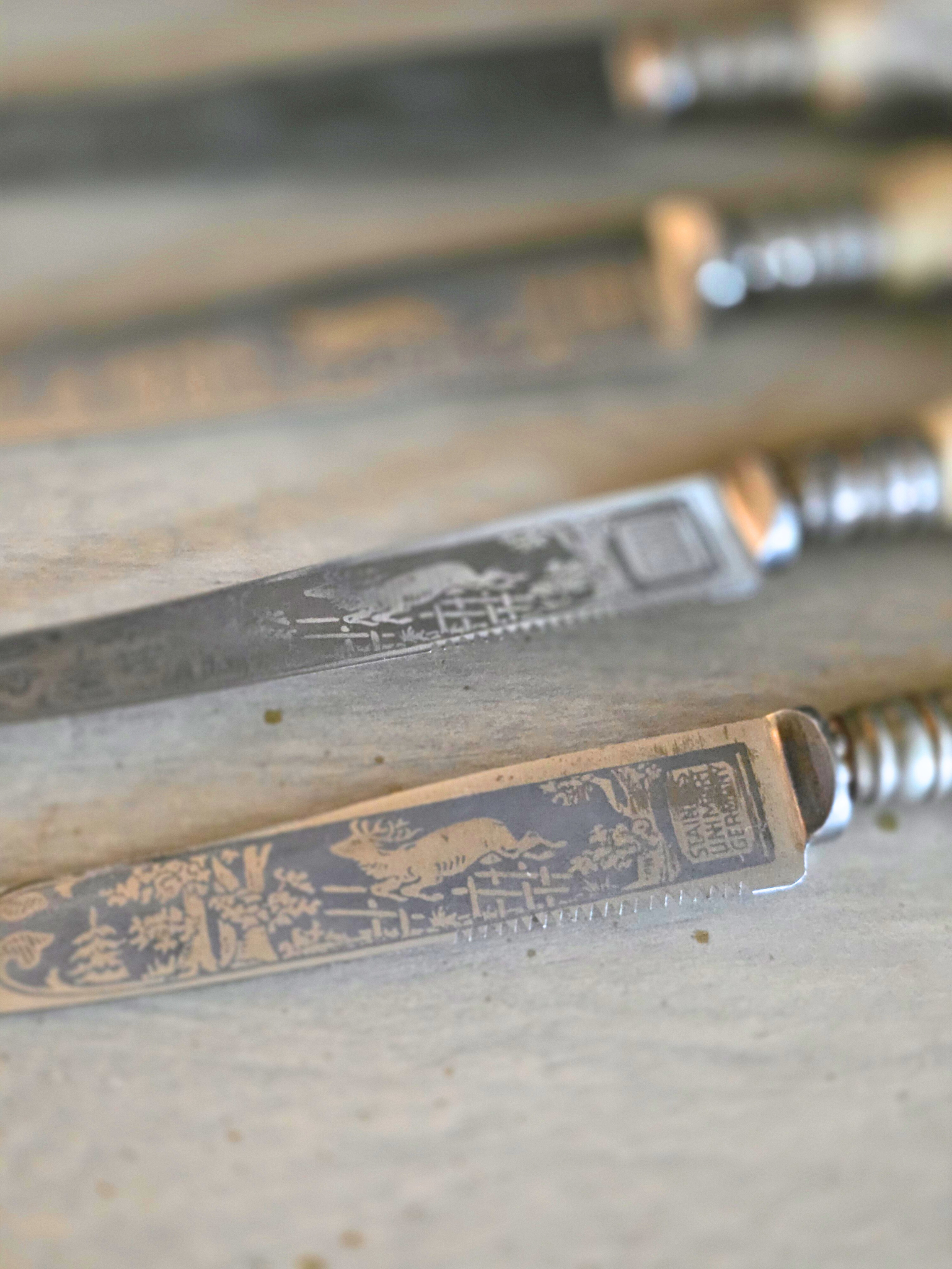 These vintage stag-handle knives embody the essence of the Black Forest aesthetic, featuring beautiful stag engraving and, naturally textured antler handles, old-world craftsmanship, and rugged Alpine charm. Each piece showcases the raw beauty of hand-carved antler, metalwork with a timeworn patina, and classic rustic detailing reminiscent of 19th-century German, great for Black Forest aesthetic displays, or Black Forest tablescape. Set of 6